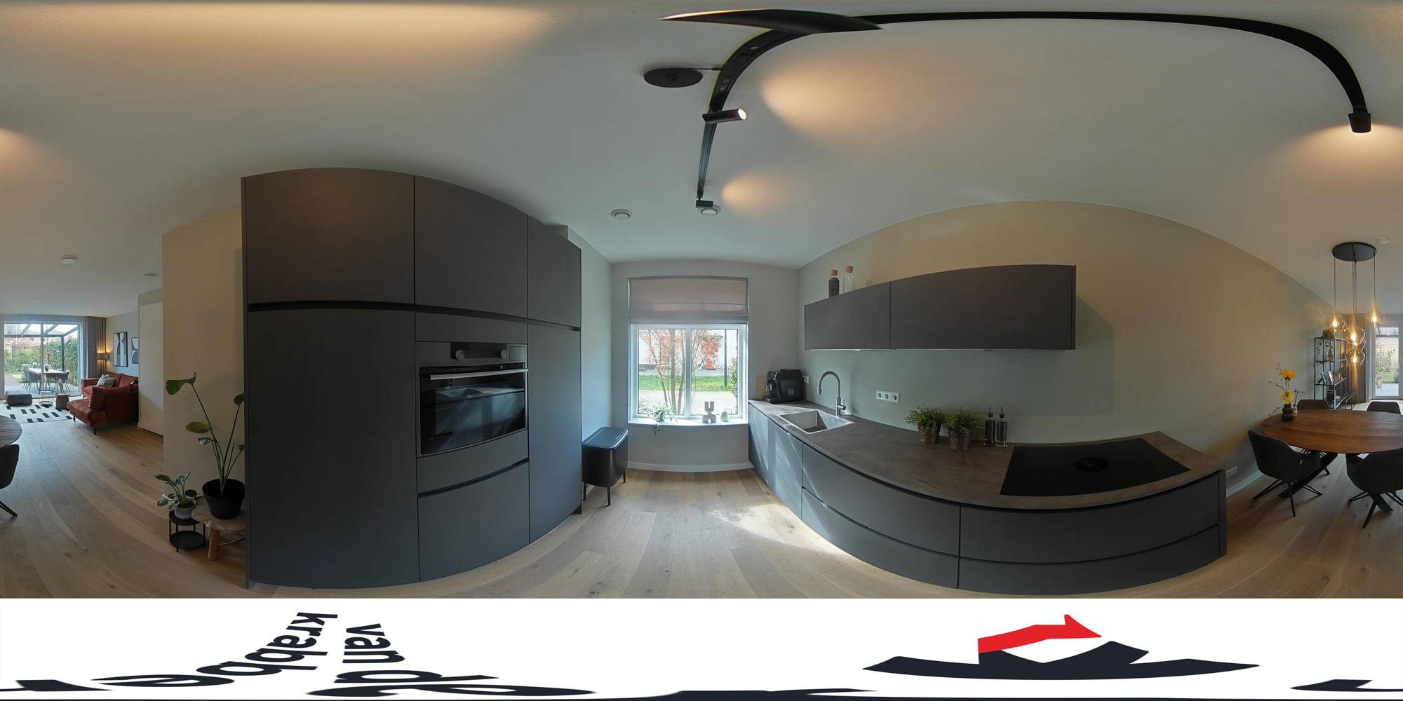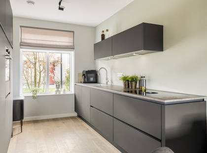 De zeer stijlvolle keuken is gelegen aan de voorkant van het huis. De combinatie van de mat-antraciet deuren en lades en het donkere aanrechtblad geeft de keuken een stoere en moderne look. De keuken is van alle gemakken voorzien: een inductiekookplaat met geïntegreerde afzuiging, Quooker kraan, vaatwasser, koelkast, vriezer, combi-stoomoven. Dankzij de vele kasten en softclose lades, biedt deze keuken zeeën aan ruimte.