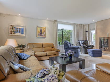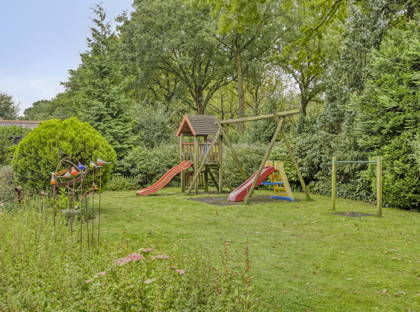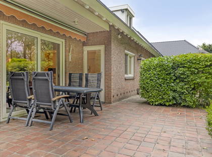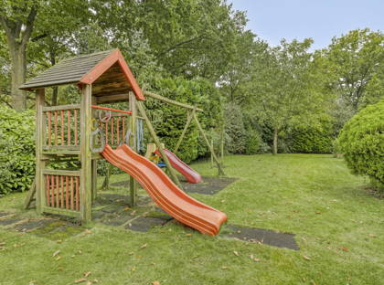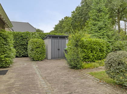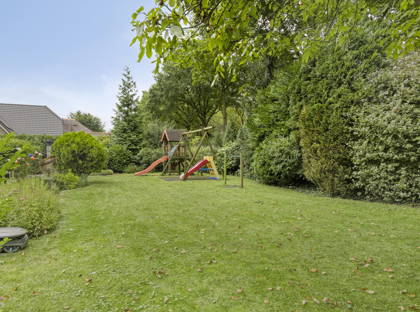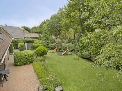 De prachtige groene tuin is toegankelijk via de schuifpui in de woonkamer en vanuit de keuken. De tuin strekt zich helemaal uit rondom het huis, waardoor er altijd wel een heerlijk plekje is om te genieten van het buitenzijn, in de zon of in de schaduw. Ook hier zorgen de volwassen bomen, planten en struiken voor een oase van groen, rust en privacy. Voor een gezin met kinderen is er ook lekker veel ruimte om te spelen of een balletje te trappen. De tuin is van alle gemakken voorzien zoals een volautomatische beregeningsinstallatie met eigen bron en ontijzerings-installatie.