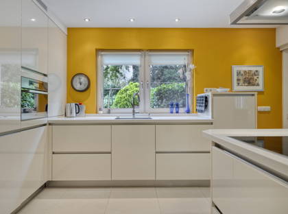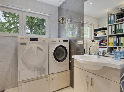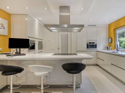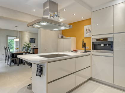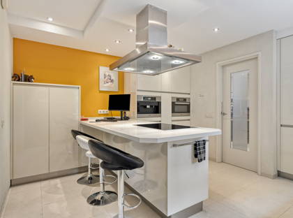 Vanuit de woonkamer loop je door naar de moderne en frisse keuken. Hier vind je zeeën aan kastruimte en moderne apparatuur van Miele: een inductiekookplaat, afzuigkap, combi magnetron/oven, stoomoven, ingebouwd koffieapparaat, vaatwasser, twee koelkasten en afzonderlijke vriezer. Aan de bar kun je gezellig ontbijten of een glaasje wijn drinken. Zo blijf je ook tijdens het koken altijd in contact met je gezin of vrienden!