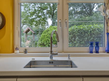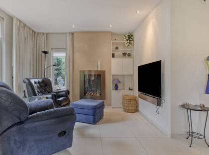 De L-vormige woonkamer is ruim en licht, dankzij de grote raampartijen aan drie zijden van het huis. De spotjes in het plafond en de lichte, onderhoudsvriendelijke tegelvloer geven de ruimte een moderne uitstraling. De gashaard staat garant voor gezellige en warme avonden in de donkere maanden van het jaar. Deze woonkamer kun je helemaal naar jouw wensen indelen; ruimte genoeg!