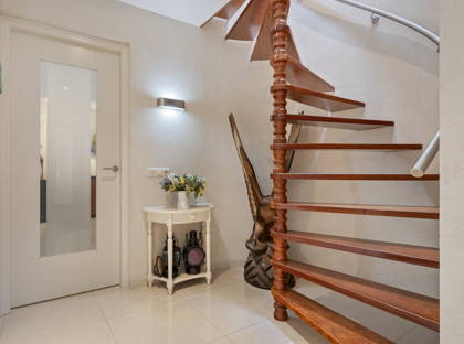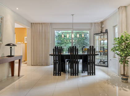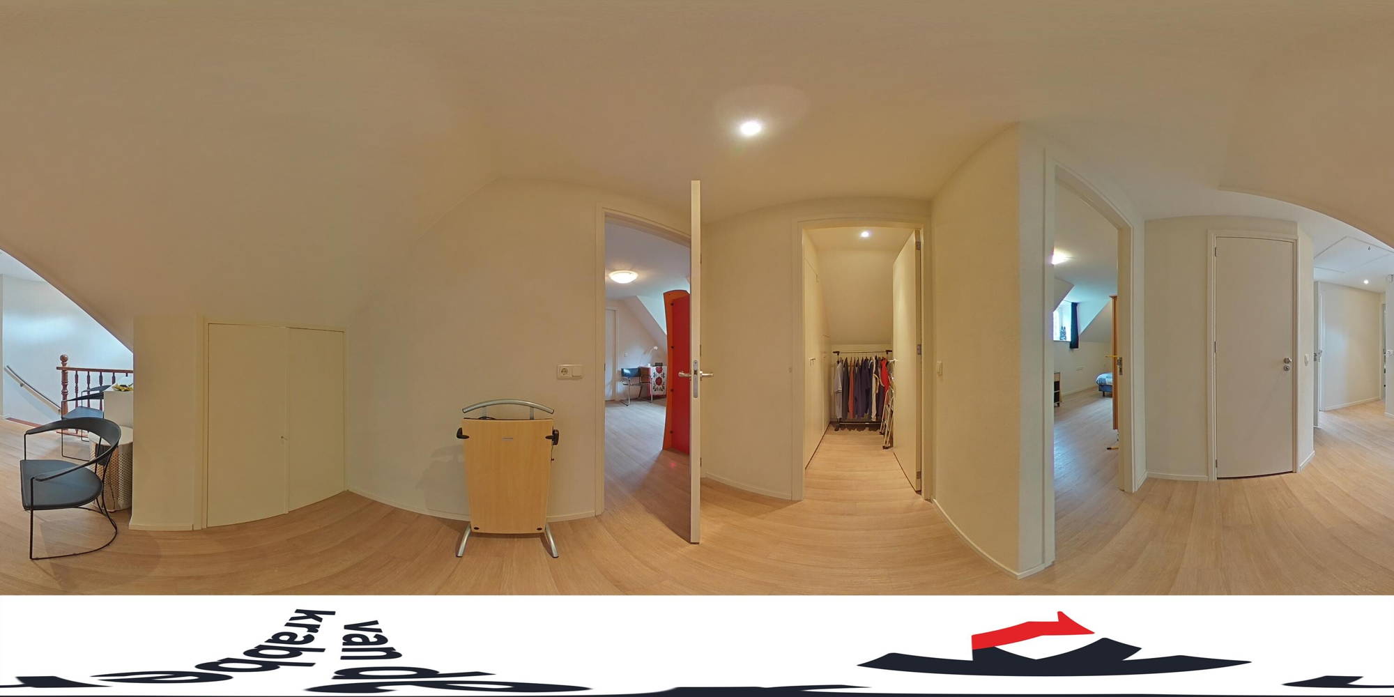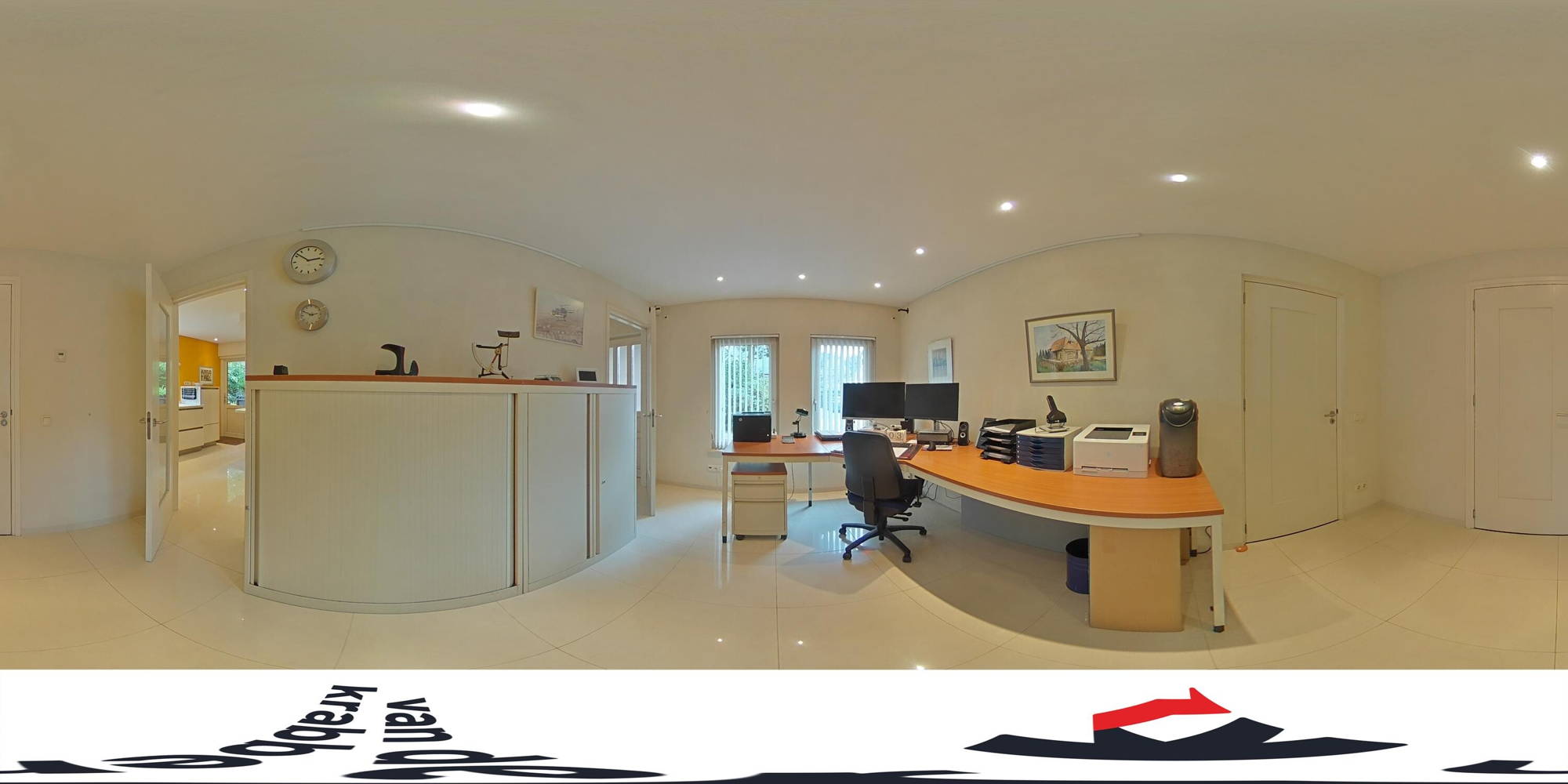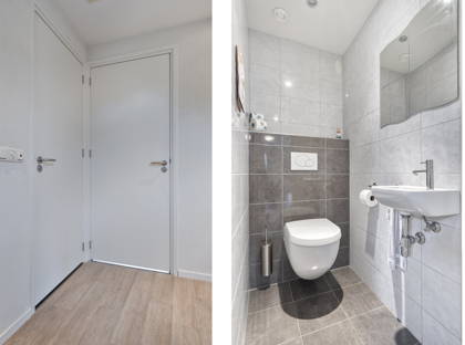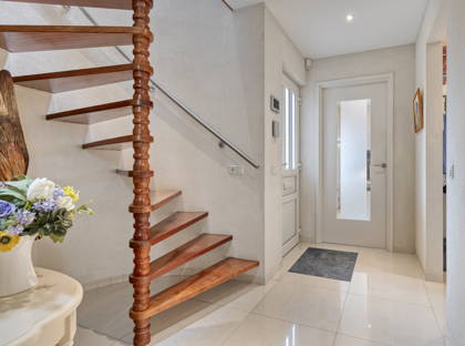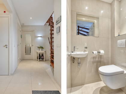 We starten de virtuele rondleiding aan de voorzijde van het huis. Op de ruime oprit kun je meerdere auto’s kwijt en vanuit hier heb je ook toegang tot de ruime garage. Dankzij de mooie volwassen bomen is deze woning omgeven door veel groen! In de ruime en frisse entree vind je de trap naar de eerste verdieping en een modern toilet. Vanuit de hal heb je toegang tot een extra kamer aan de voorzijde van het huis. Ideaal als thuiskantoor, salon, hobbyruimte of slaapkamer met aangrenzende badkamer op de begane grond. De gehele begane grond (met uitzondering van de garage) is voorzien van vloerverwarming en vloerkoeling.
