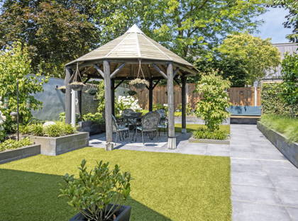 Als kers op de taart is er nog de achtertuin. Deze is zeer verzorgd en sfeervol aangelegd met beplante borders en middenin de tuin een terras met een ronde overkapping. Een tegelpad geeft toegang tot de verschillende terrassen.