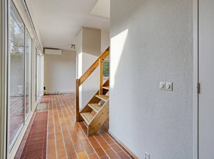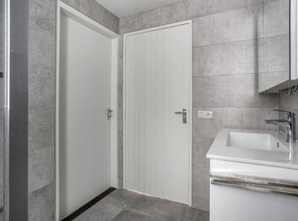 Op de eerste verdieping vind je drie slaapkamers, allemaal voorzien van knieschotten voor extra bergruimte. De hoofdslaapkamer heeft een airco én een directe deur naar de badkamer. Een van de andere slaapkamers beschikt over een eigen wastafel. De badkamer is modern uitgevoerd met een inloopdouche, toilet, designradiator en een stijlvol wastafelmeubel.
