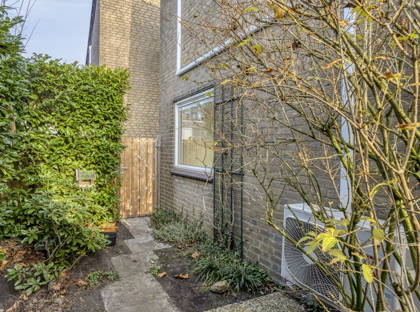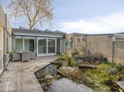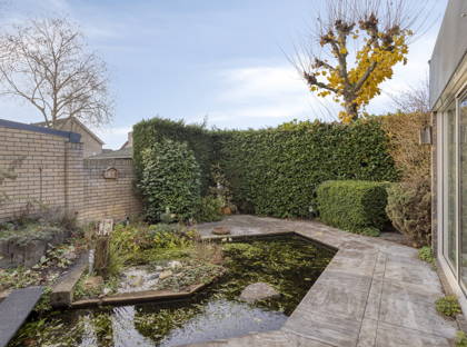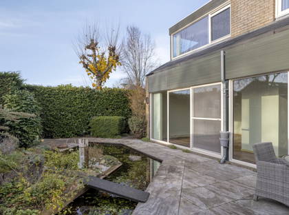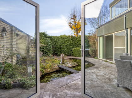De tuin is een fijne, groene buitenruimte met een mooi terras, een vijver en volop privacy. Hij ligt op het zuiden, waardoor je hier de hele dag zon hebt. Dankzij het elektrische zonnescherm creëer je in een handomdraai schaduw. Vanuit vrijwel de hele begane grond heb je direct contact met de tuin, een heerlijke verbinding tussen binnen en buiten. Tevens beschikt de tuin over een handige achterom.