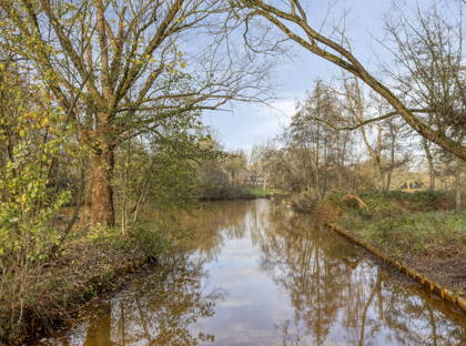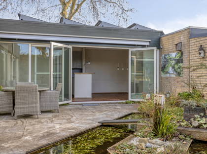 • Zonnige, groene achtertuin op het zuiden met vijver, privacy en elektrisch zonnescherm