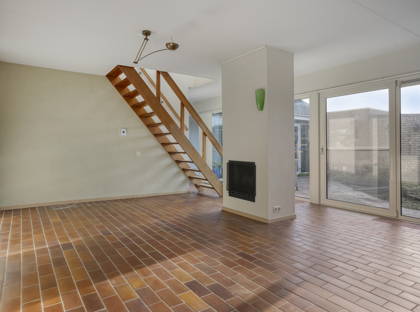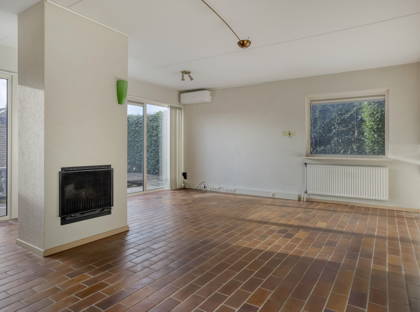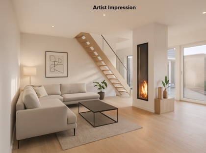 Bij aankomst zie je de strakke voorgevel met de voordeur en de (automatische) garagedeur van de inpandige garage. Binnen kom je in de entree met meterkast, garderobenis en toegang tot het woongedeelte. Zodra je de woonkamer binnenstapt, valt het licht en de ruimte op. De grote glazen raampartijen geven vrij zicht op de tuin en laten veel daglicht binnen. In het midden van de woonkamer staat een open haard als sfeervol middelpunt en dankzij de airco zit je hier altijd comfortabel.