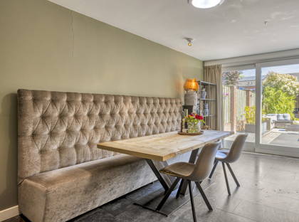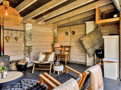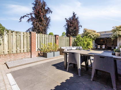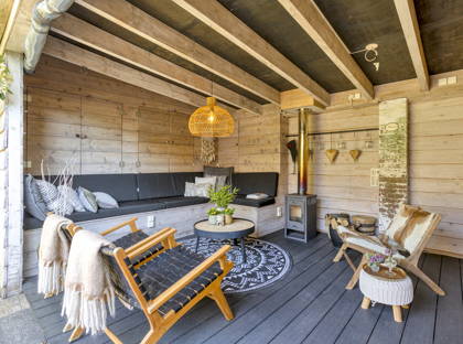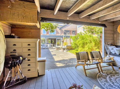 De tuin is diep, breed en grotendeels bestraat – dus onderhoudsarm. Helemaal achterin vind je het tuinhuis met een sfeervolle, overdekte veranda met houtkachel, loungebank en houten vloer. Een heerlijke plek voor lange zomeravonden of knusse wintermomenten.