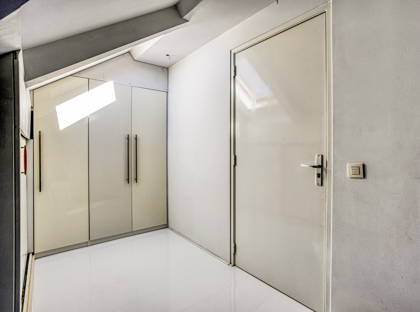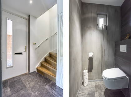Je parkeert je auto op je eigen oprit, eventueel onder de carport met lichtkoepels. Via de ingang aan de achterkant van de carport, loop je de multifunctionele ruimte binnen. Deze is nu in gebruik als kantoor en wasruimte – ideaal voor thuiswerkers of hobbyisten. Aan de zijkant van het huis bevindt zich de voordeur, die toegang geeft tot een ruime hal met fraaie natuurstenen vloer. Hier bevinden zich de meterkast, het toilet en de trapopgang.