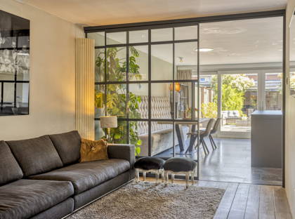 - Uitgebouwde tuinkamer met brede schuifpui en glasgevel. Deze schuifpui heeft elektrische screens, welke voor alle ramen afzonderlijk te bedienen zijn.