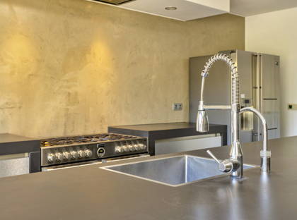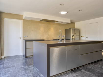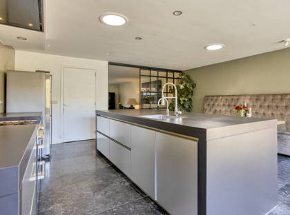De leefkeuken is modern, luxe én praktisch ingericht. Deze is voorzien van een kookeiland met spoelgedeelte, Quooker en veel kastruimte. De grote schuifpui en glasgevel zorgen voor een prachtig uitzicht op de tuin én een overvloed aan daglicht. Deze schuifpui heeft elektrische screens, welke voor alle ramen afzonderlijk te bedienen zijn. De keuken is subtiel afgescheiden van de woonkamer door een stijlvolle glazen schuif(deur)wand met softclose systeem. Hierdoor blijven de ruimtes open en verbonden, maar krijgt elk deel toch zijn eigen sfeer.