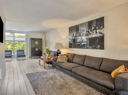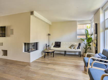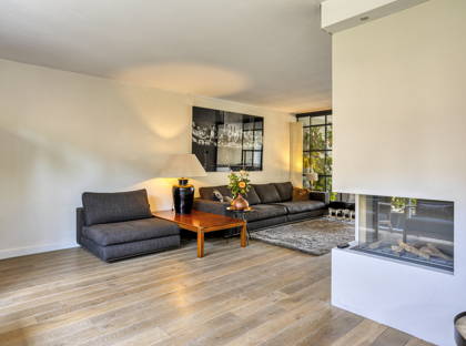 Aan de voorzijde bevindt zich de gezellige woonkamer, met houten vloer, sfeervolle gashaard en grote ramen voor extra lichtinval. De neutrale kleuren en strakke afwerking maken het een fijne plek om thuis te komen.