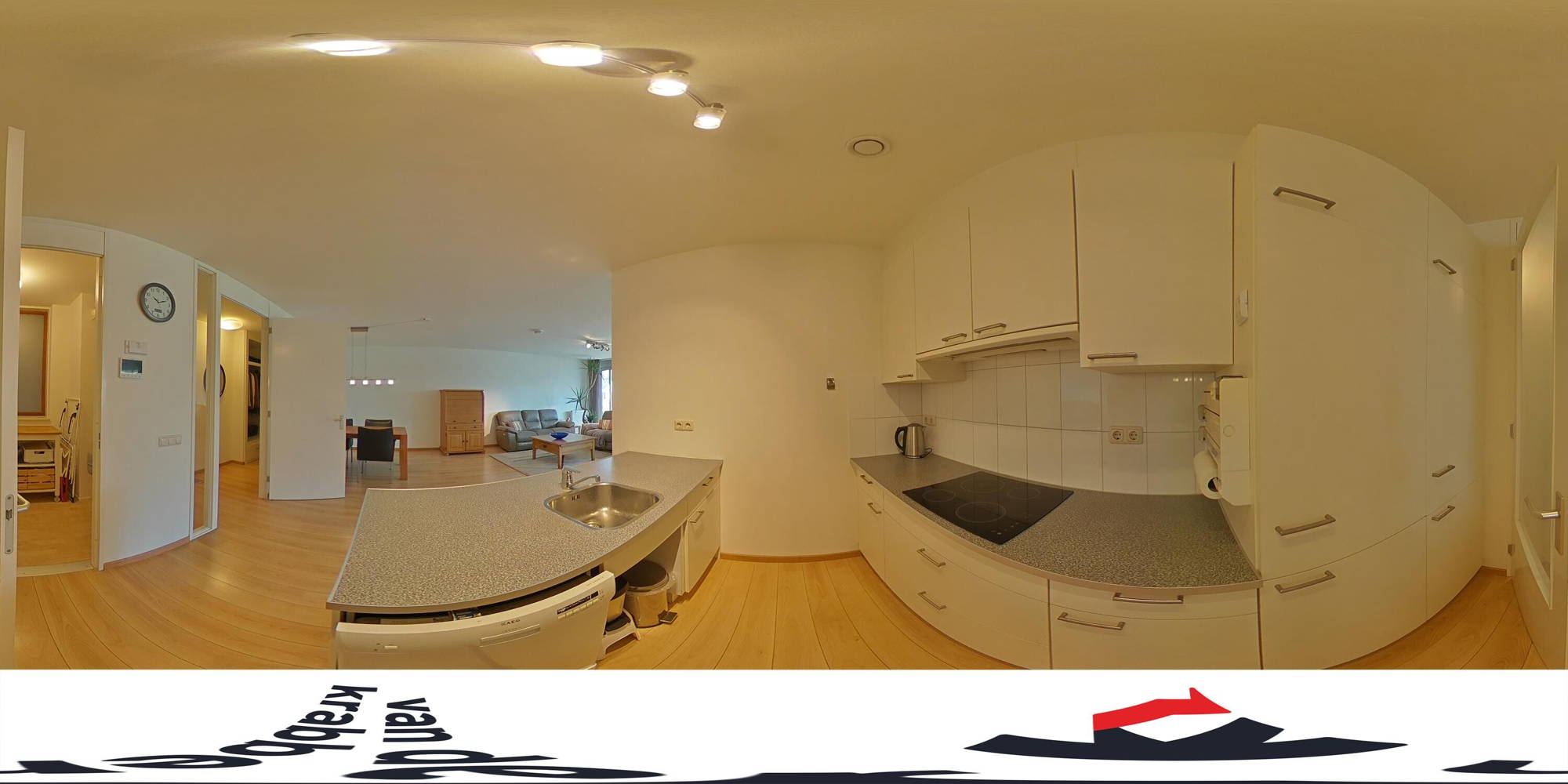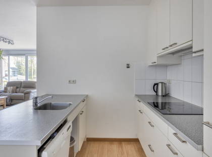 De open keuken sluit netjes aan op de woonkamer en is praktisch ingericht met de benodigde inbouwapparatuur: kookplaat, afzuigkap, vaatwasser en koel-vriescombinatie.