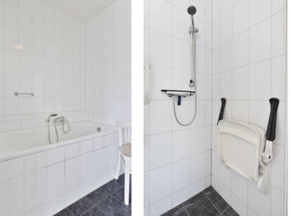 De slaapkamer is ruim en licht, met grote ramen en handige inbouwkasten voor extra bergruimte. De en-suite badkamer is compleet uitgevoerd met een ligbad, douche, toilet en wastafel. Zowel de badkamer als het separate toilet zijn voorzien van ondersteunende aanpassingen.