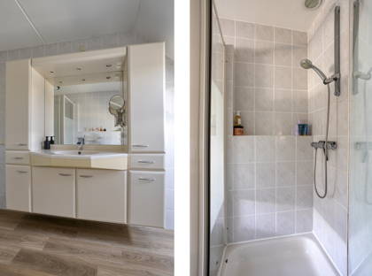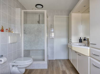 • Badkamer met ligbad, douche, toilet en wastafelmeubel