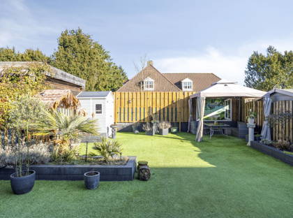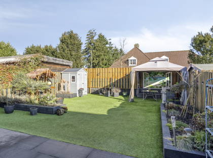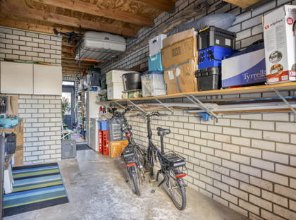 Ook buiten is het goed toeven. De achtertuin is ruim en onderhoudsvriendelijk aangelegd en biedt volop ruimte om te ontspannen, spelen of gezellig te barbecueën. Achterin de tuin staat een schuurtje voor extra bergruimte. De aangebouwde garage met roldeur maakt het plaatje compleet.