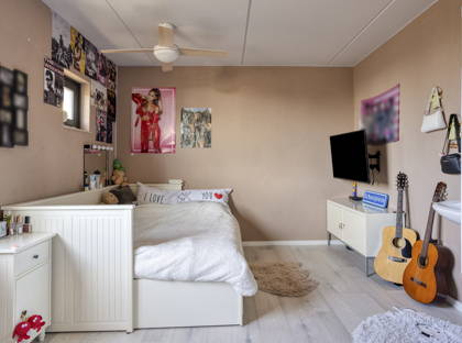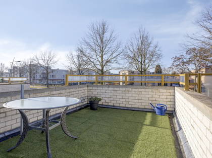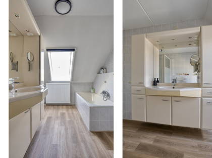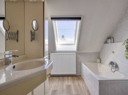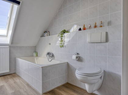 Op de eerste verdieping vind je twee ruime slaapkamers, beide met grote ramen en veel daglicht. Eén van deze kamers heeft bovendien toegang tot het dakterras – een fijne extra plek om buiten te zitten. De badkamer is compleet uitgerust met een wastafelmeubel, toilet, douche en ligbad. Alle slaapkamers zijn uitgevoerd met rolluiken, wat zorgt voor extra comfort en verduistering.