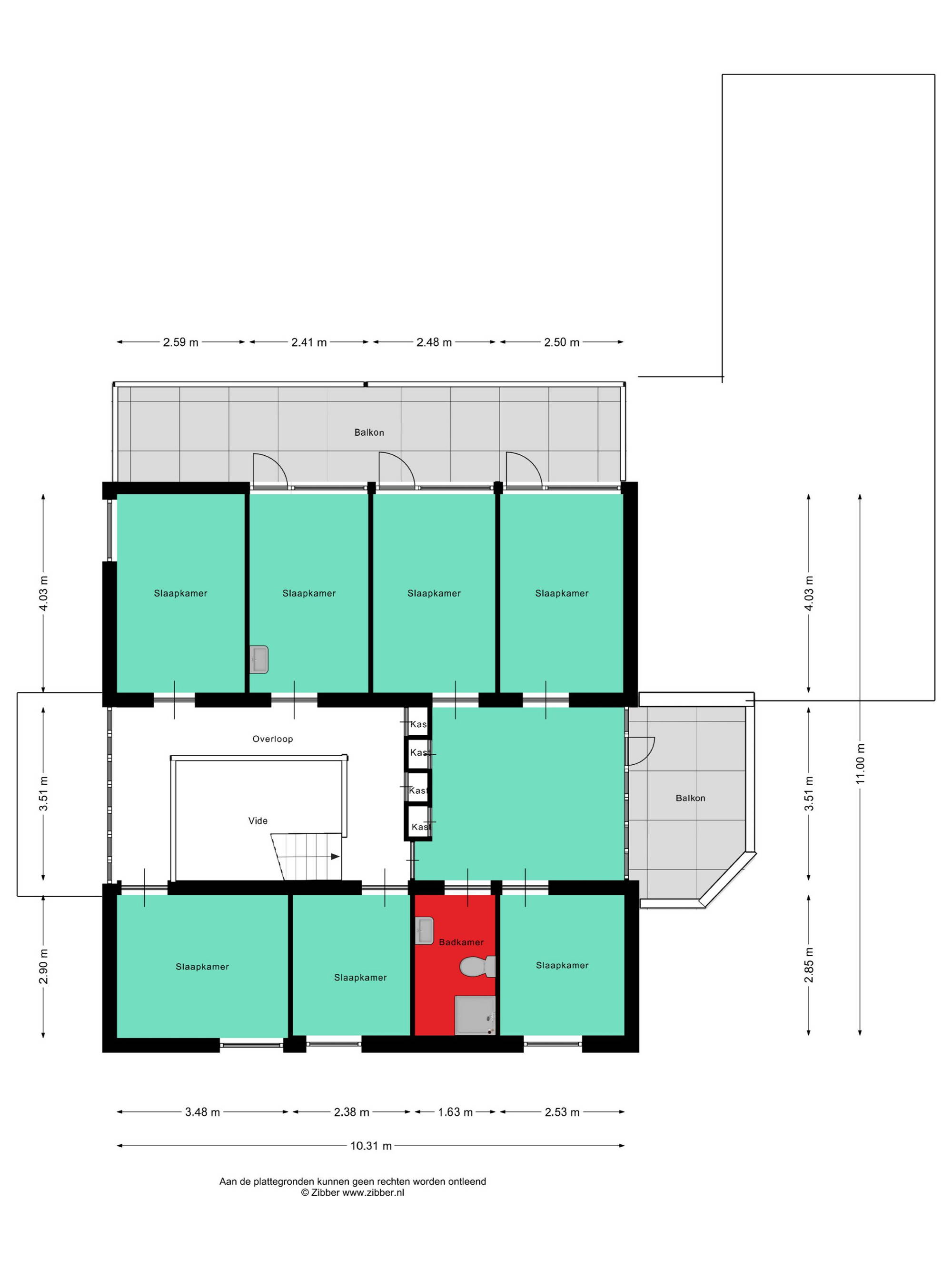 De eerste verdieping van de woning beschikt over maar liefst 7 slaapkamers. De overloop biedt veel kastruimte en er is een tussenruimte/zitkamer met toegang tot het balkon. Aan de tuinzijde is er nog een groot balkon over de breedte van de woning, met toegang vanuit 3 slaapkamers. De badkamer op deze verdieping is voorzien van een wastafel, toilet en douchecabine.