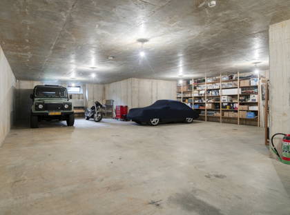 Zoals we al zeiden is er in deze woning aan ruimte geen gebrek. Het souterrain, dat onder de hele woning doorloopt, draagt hier zeker aan bij. Momenteel wordt deze verdieping gebruikt voor opslag en voor het stallen van auto’s en motoren. Dankzij de innovatieve autolift kun je deze eenvoudig naar de garage in de kelder verplaatsen. Deze kelder biedt enorm veel mogelijkheden om luxe woonwensen waar te maken, zoals een wellnessruimte, bioscoop, game room of café aan huis.