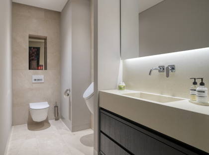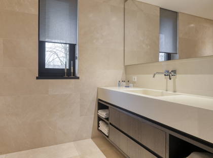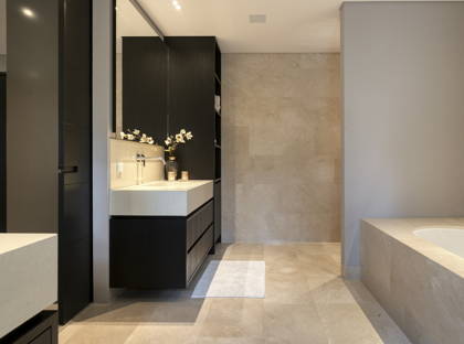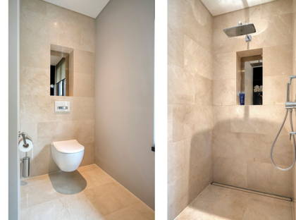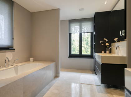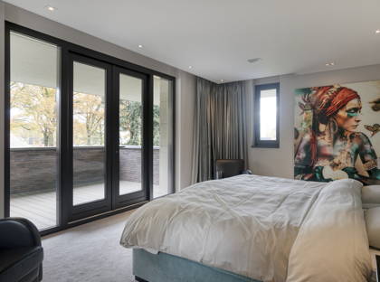 De bovenverdieping is – zoals je verwacht in deze woning – ook heerlijk ruim. Hier vind je drie ruime slaapkamers, twee badkamers en een wasruimte. De master bedroom heeft een eigen balkon, een walk-in closet en een ensuite badkamer. Hier waan je je in een luxe hotel! Deze badkamer is bijzonder fraai ingericht met kwalitatieve materialen. Hier vind je twee losse wastafels, een toilet, een inloopregendouche en een ruim ligbad. De overige slaapkamers zijn allen ruim en licht. De tweede badkamer is voorzien van een wastafel, toilet en douche.