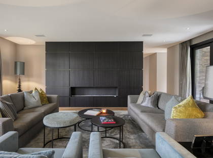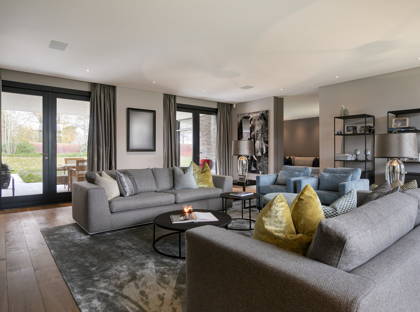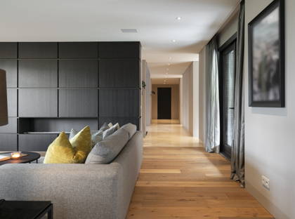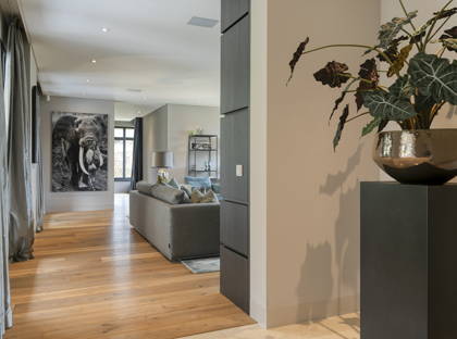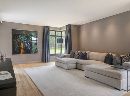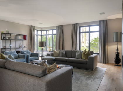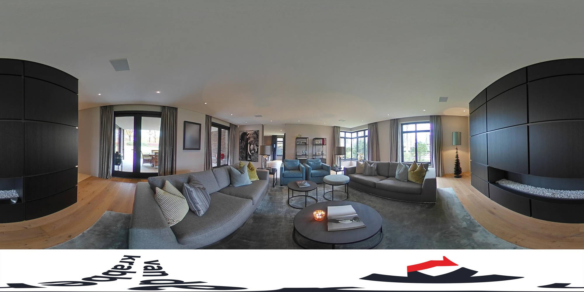 De woonkamer is ruim en knus tegelijk, mede dankzij de mooie houten vloer. Door raampartijen aan meerdere zijden geniet je hier van veel lichtinval. Een indrukwekkende inbouwhaard van Boley is het centrale punt in deze ruimte. Met het ontwerp van deze villa is bovendien direct een slim lichtplan gemaakt; door het hele huis zijn inbouwspots te vinden.
