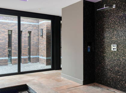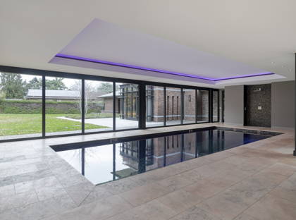 Naast de keuken is nog een hal – met toilet – die toegang biedt tot de grootste verrassing van dit huis: een fantastisch binnenzwembad! Baantjes trekken in de ochtend, genieten met een drankje in de avond of een speelparadijs voor de kinderen in de middag: dit zwembad kun je het hele jaar door gebruiken. Je hebt bovendien prachtig uitzicht op de tuin en er is ruimte om een relaxhoek te maken.