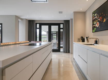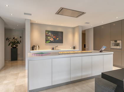 De keuken is letterlijk en figuurlijk het hart van het huis. In deze heerlijke woonkeuken van Bulthaup vallen wederom de hoogwaardige afwerking en kwalitatieve materialen op. De greeploze eilandkeuken biedt veel ruimte, zowel op het aanrecht als in de lades en de kasten. De keuken is uitgerust met een kookplaat, afzuigkap, Gaggenau combi stoomoven, koel-vriescombinatie en vaatwasser. In de woonkeuken is verder ruimte voor een grote tafel om met de hele familie te genieten. Mét prachtig uitzicht op de tuin!