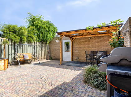 Zowel vanuit de keuken als de woonkamer heb je toegang tot de tuin. Deze is praktisch en onderhoudsvriendelijk aangelegd. Onder de overkapping achter in de tuin zit je heerlijk, ook als het weer even niet meezit. Vanuit de tuin heb je ook toegang tot de garage, die zeeën van bergruimte biedt. De garage is ook bereikbaar aan de achterzijde van woning, waar een grote roldeur zit.