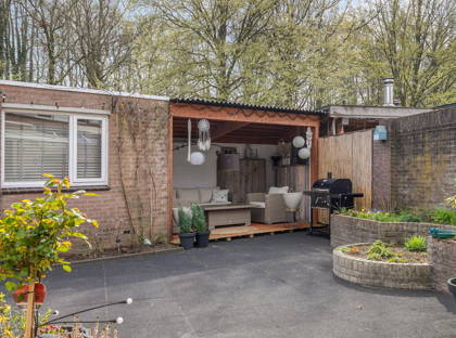 De achtertuin is gelegen op het zuidoosten en is verzorgd aangelegd met bestrating, beplanting, een overkapping aan de woning en een recent gebouwde overkapping achterin de tuin. Daarnaast is er een berging en een achterom aanwezig.