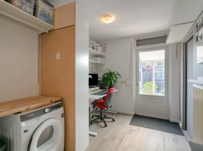 Vanuit de aanbouw is tevens toegang tot een praktische bijkeuken/werkruimte met aansluitingen voor witgoed en extra bergruimte. Achter deze ruimte bevindt zich nog een separate opslagruimte met eigen ingang. De separate entree biedt aanzienlijke voordelen en mogelijkheden voor het realiseren van een eigen bedrijfsruimte.