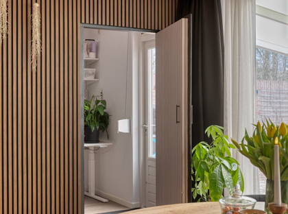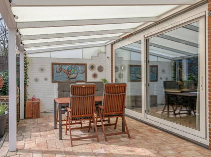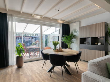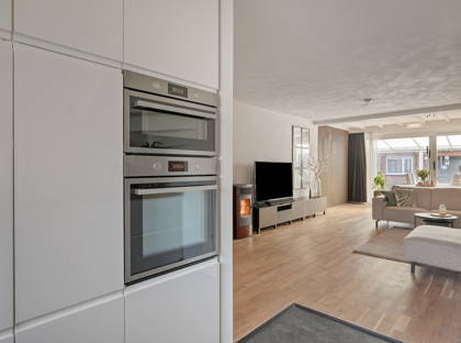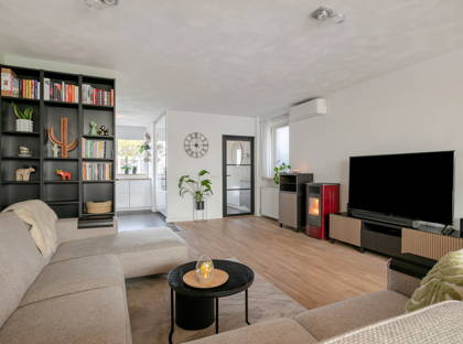 De woonkamer is sfeervol en ruim opgezet met een zithoek centraal in de woning en een eethoek in de aanbouw aan de achterzijde. De woonkamer is voorzien van een fraaie eikenhouten vloer en beschikt over een nieuwe airco-installatie (Mitsubishi, 2024) en een pelletkachel. Vanuit de eethoek zorgt een kunststof schuifpui (ca. 2016, dubbele beglazing) voor een prettige lichtinval en directe verbinding met de tuin.