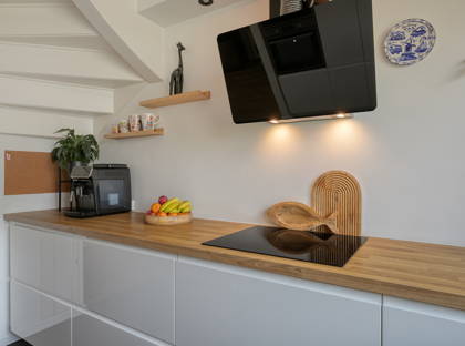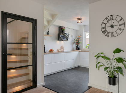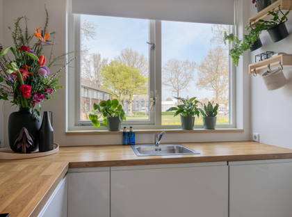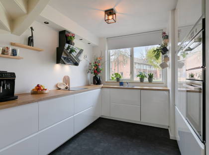 De keuken is aan de voorzijde van de woning gelegen en circa 3 jaar oud. Deze moderne keuken is voorzien van diverse inbouwapparatuur, waaronder een inductiekookplaat, afzuigkap, vaatwasser, oven, magnetron en koelkast. De keuken heeft een PVC-vloer en biedt vrij uitzicht op het groene hofje.