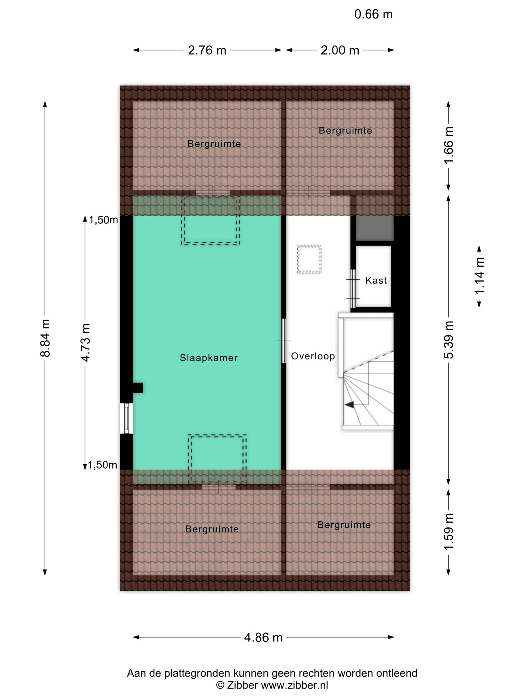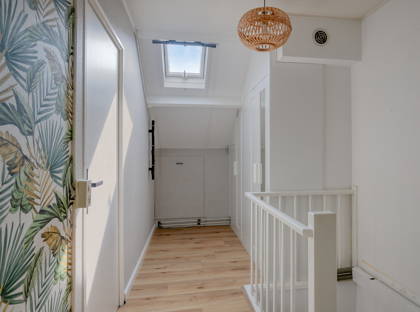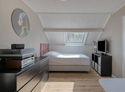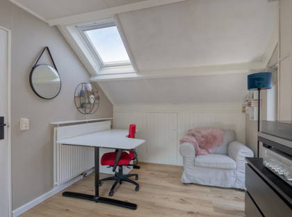De vierde slaapkamer is ruim en beschikt over twee Velux dakramen (waarvan één recent met HR++ glas). Tevens is er extra bergruimte aanwezig achter knieschotten.