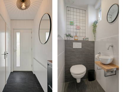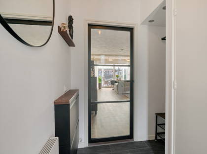 De entree biedt toegang tot de hal met garderoberuimte, een modern toilet (circa 4 jaar geleden vernieuwd met fonteintje en mechanische ventilatie), de meterkast (gemoderniseerd met extra groep) en toegang tot de woonkamer.