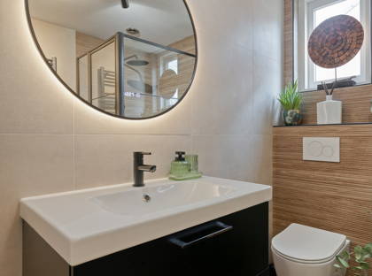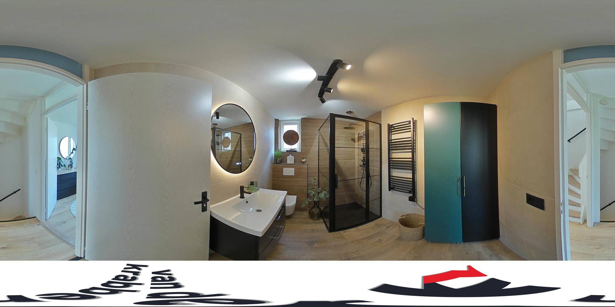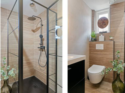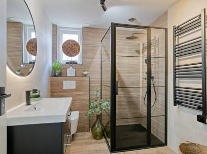 De moderne badkamer is centraal gelegen en uitgerust met een inloopdouche met stalen deur, dubbel wastafelmeubel, zwevend toilet en een designradiator.