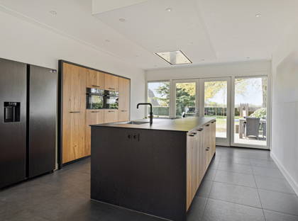 Als je doorloopt naar de woonkamer en keuken, stap je tientallen jaren vooruit in de tijd. Hier zie je duidelijk dat de woning voor een heel groot deel compleet gemoderniseerd is. Dankzij de vele grote raampartijen baden de woonkamer en keuken in het licht. De moderne antracietgrijze tegelvloer is doorgelegd op de hele benedenverdieping en is voorzien van vloerverwarming. In de L-vormige woonkamer is ruimte voor een grote eettafel en een gezellige zithoek.
