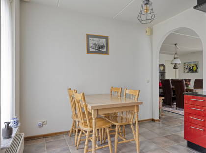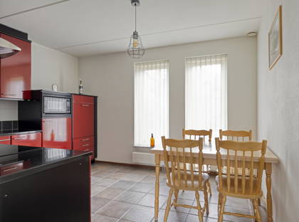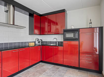Als je onder de toog doorloopt, kom je in de halfopen hoekkeuken. Deze is door de rode kleur een echte eyecatcher! Dankzij de vele kast- en aanrechtruimte, kom je hier nooit ruimte te kort. De keuken is uitgerust met een kookplaat, afzuigkap, magnetron, koelkast en vaatwasser. In de keuken is ook plek voor een ontbijttafel, zodat je ook hier in contact blijft met de rest van het gezin.