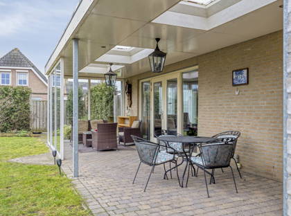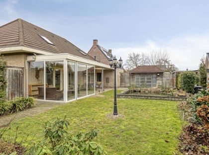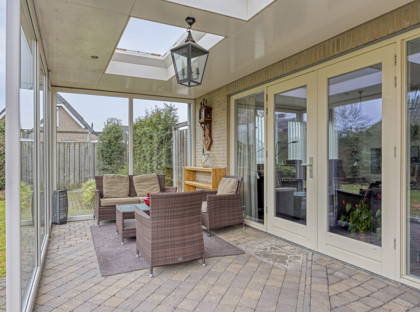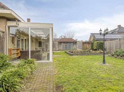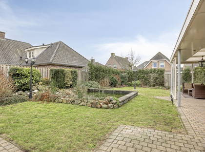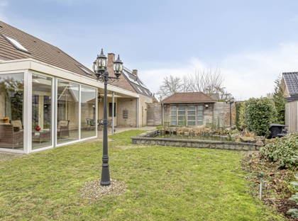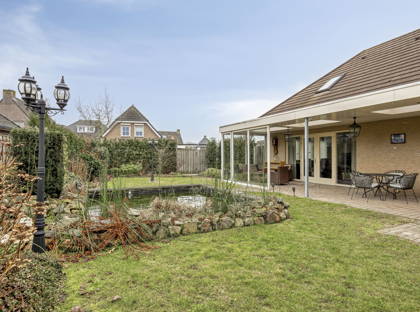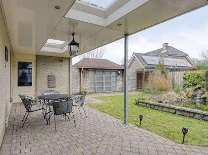 De openslaande deuren in de woonkamer bieden toegang tot de heerlijke achtertuin. Hier geniet je van veel privacy en veel groen, dankzij de volwassen beplanting. De vijver zorgt voor extra charme! Aan het huis is een zeer grote overkapping, die deels is afgesloten met glazen panelen. Hier kun je meerdere zitplekjes creëren en kun je altijd droog en uit de wind zitten. Hierdoor is de tuin het hele jaar door een fijne plek om te vertoeven! Vanuit de tuin heb je ook toegang tot de grote garage en enkele bergingen achter in de tuin. Aan opbergruimte heb je in dit huis dus zeker geen gebrek.