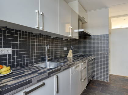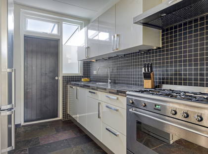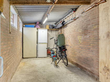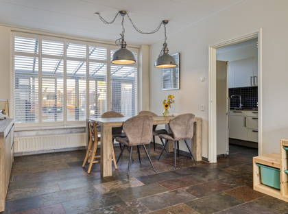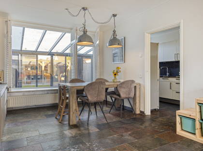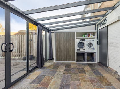 In de praktische keuken is veel aanrecht- en kastruimte. Hier vind je een gasfornuis, afzuigkap, oven, koel-vriescombinatie en een vaatwasser. Vanuit de keuken heb je toegang tot de aangebouwde serre, de verrassing van dit huis! Deze zeer lichte en ruime kamer kun je op allerlei manieren gebruiken: als extra woonkamer, speelkamer, thuiskantoor, sportruimte, noem maar op. In de serre is ook een slimme plek gecreëerd voor de wasmachine en de droger.
