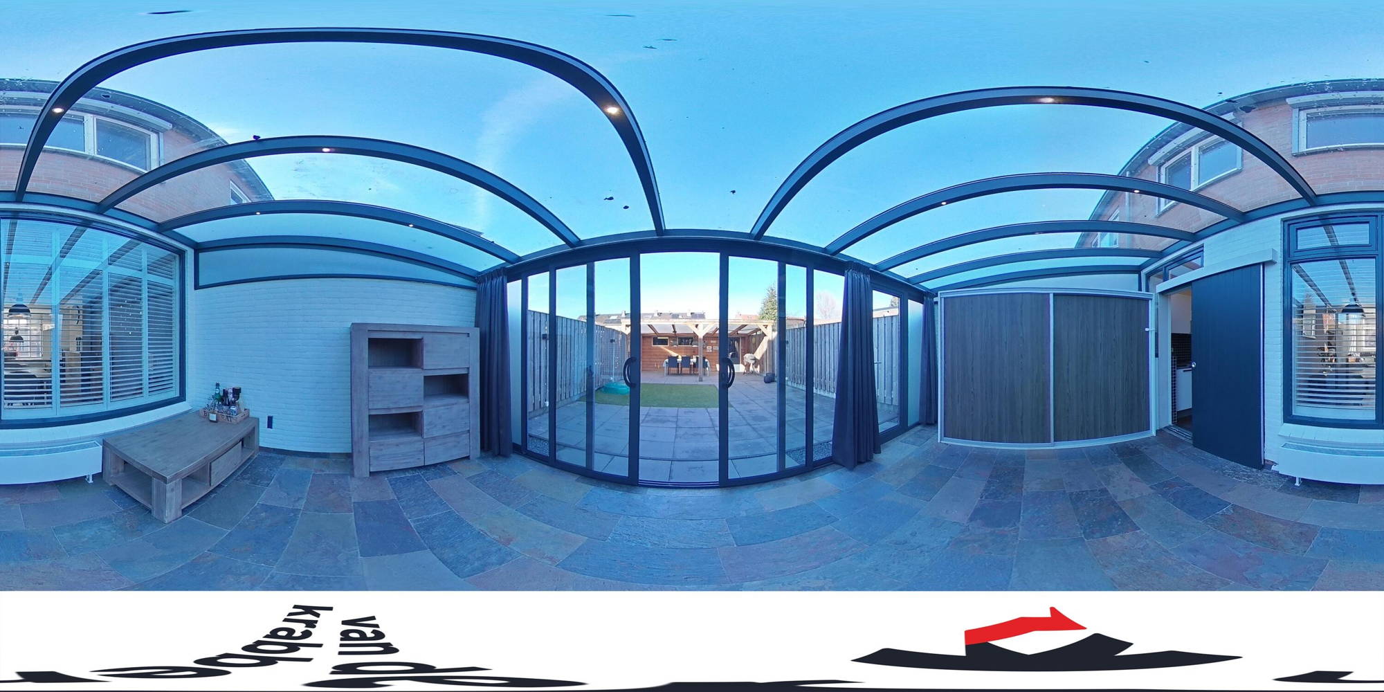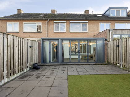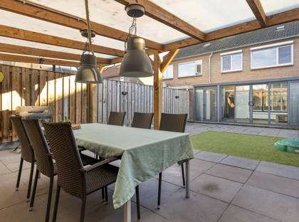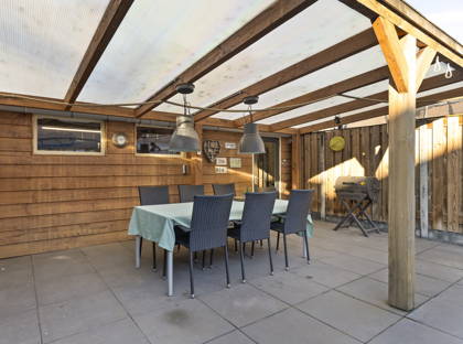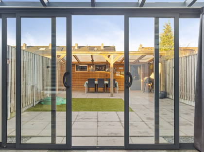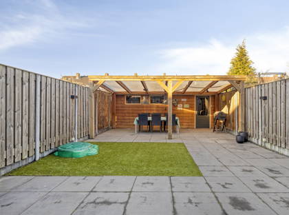 Vanuit de serre heb je uitzicht op de keurig aangelegde en onderhoudsvriendelijke achtertuin. Achter in de tuin is een grote overkapping, waardoor je altijd een plekje hebt om droog en warm een kopje koffie te drinken of samen te eten. Aan de overkapping is ook een ruime berging, ideaal voor het opbergen van fietsen, (tuin)gereedschap en andere spullen.