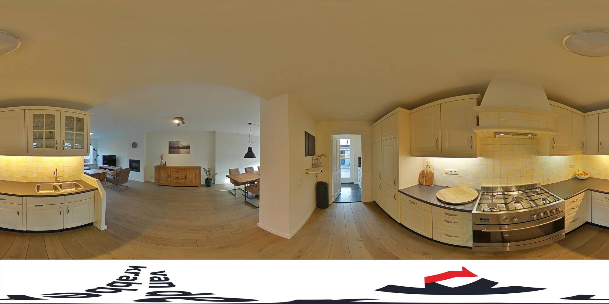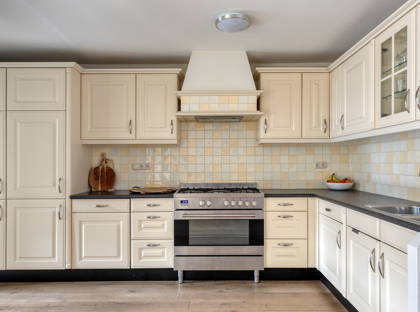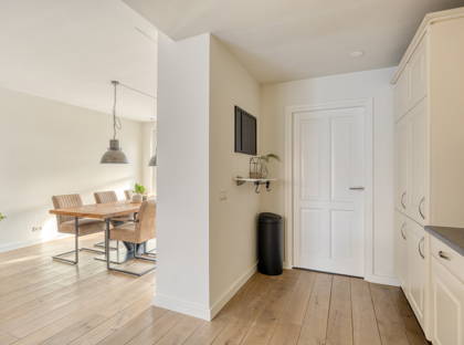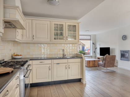 In het midden van de woning ligt de riante, halfopen keuken. Aan aanrecht- en kastruimte geen gebrek! De keuken is voorzien van een fraai vrijstaand gasfornuis met oven, afzuigkap, koel-vriescombinatie en vaatwasser. Achter de keuken ligt een praktische bijkeuken, waar ook ruimte is voor de wasmachine en de droger.