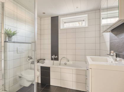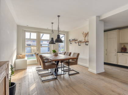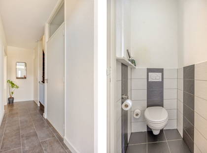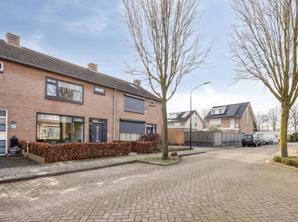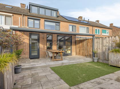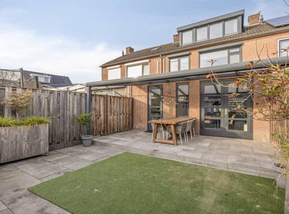 Aan de achterzijde van de woning is de eetkamer; hier kun je met gemak een grote eettafel kwijt. Genieten met het hele gezin dus! Vanuit hier bieden de openslaande deuren toegang tot de fijne tuin. Zo kun je in de zomer het binnen- en buitenleven met elkaar combineren. In de tuin is een groot terras, mét overkapping. Hier zit je altijd lekker met een kopje koffie of een diner; weer of geen weer. Verder is de tuin onderhoudsvriendelijk en netjes ingericht. Achter in de tuin is nog een ruime berging, voor fietsen, (tuin)gereedschap en andere spullen.