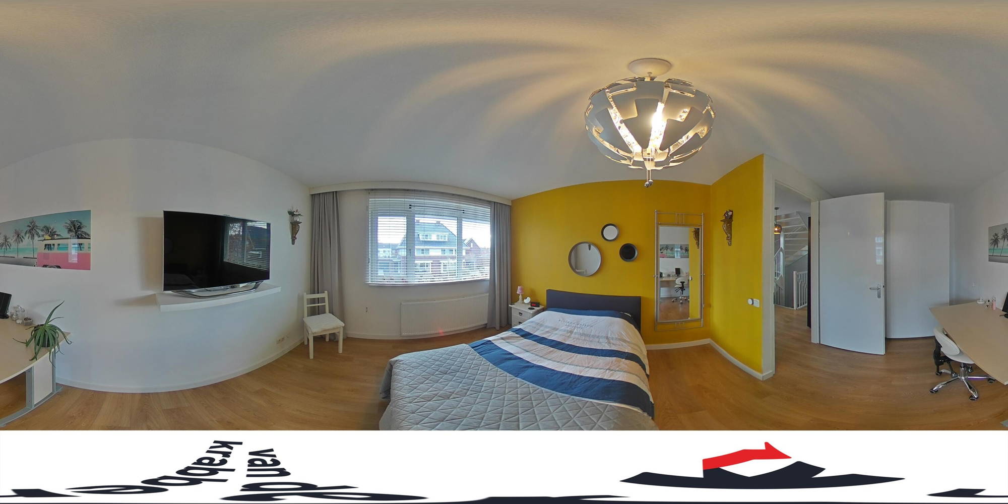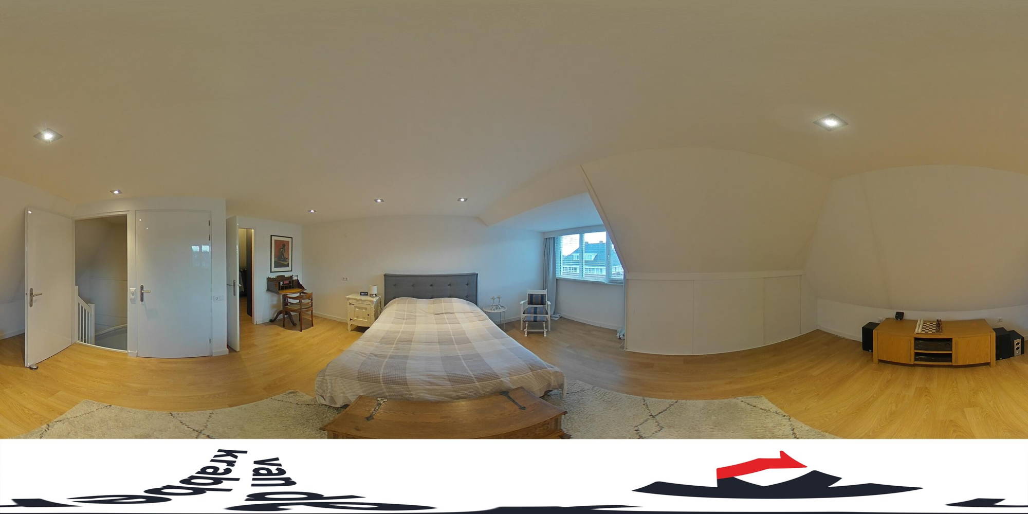 De volgende vaste trap leidt naar de tweede verdieping, die fraai ingericht en verrassend ruim is. Hier is een grote slaapkamer en een walk-in closet. Er zijn ook voorbereidingen getroffen om hier een extra badkamer te creëren. Boven deze kamer is nog een vlieringzolder; perfect voor het opbergen van spullen die je niet dagelijks gebruikt.