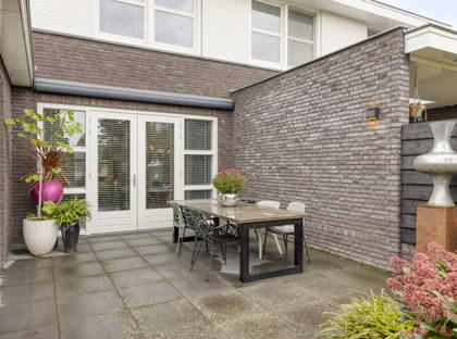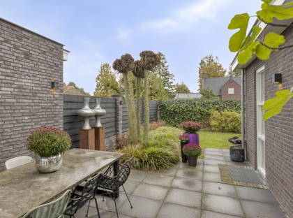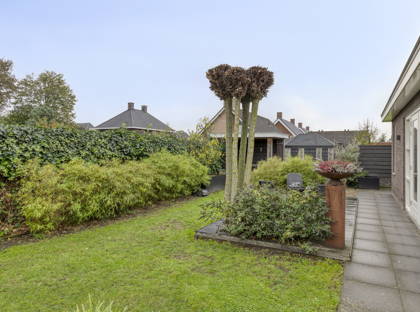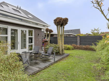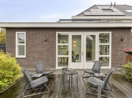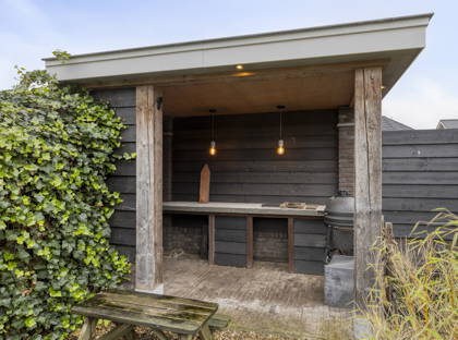 De tuin is fraai aangelegd met een mooie mix van groen en bestrating. Direct aan de keuken ligt een fijn terras, en ook bij de serre vind je een vlonderterras waar je heerlijk kunt zitten. Achterin de tuin is een overkapping met een buitenkeuken – de ideale plek voor lange zomeravonden of een gezellige BBQ met vrienden.
