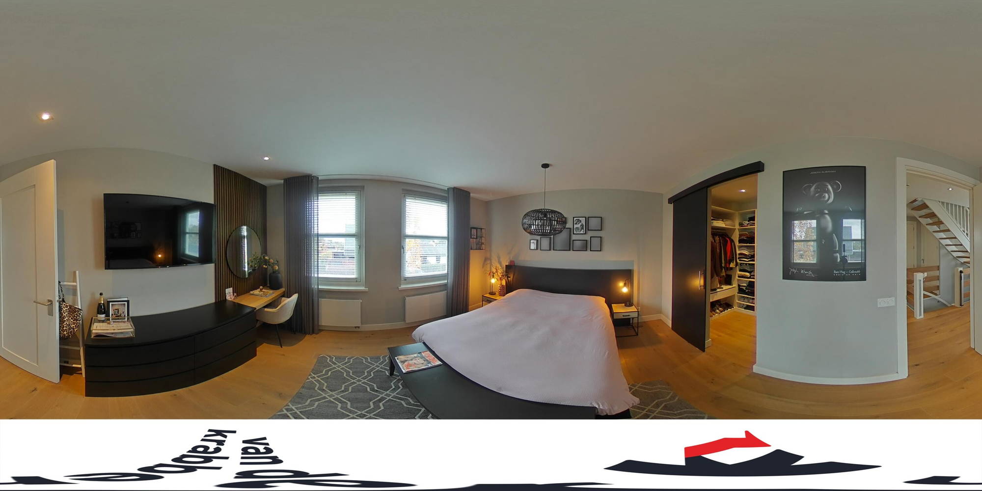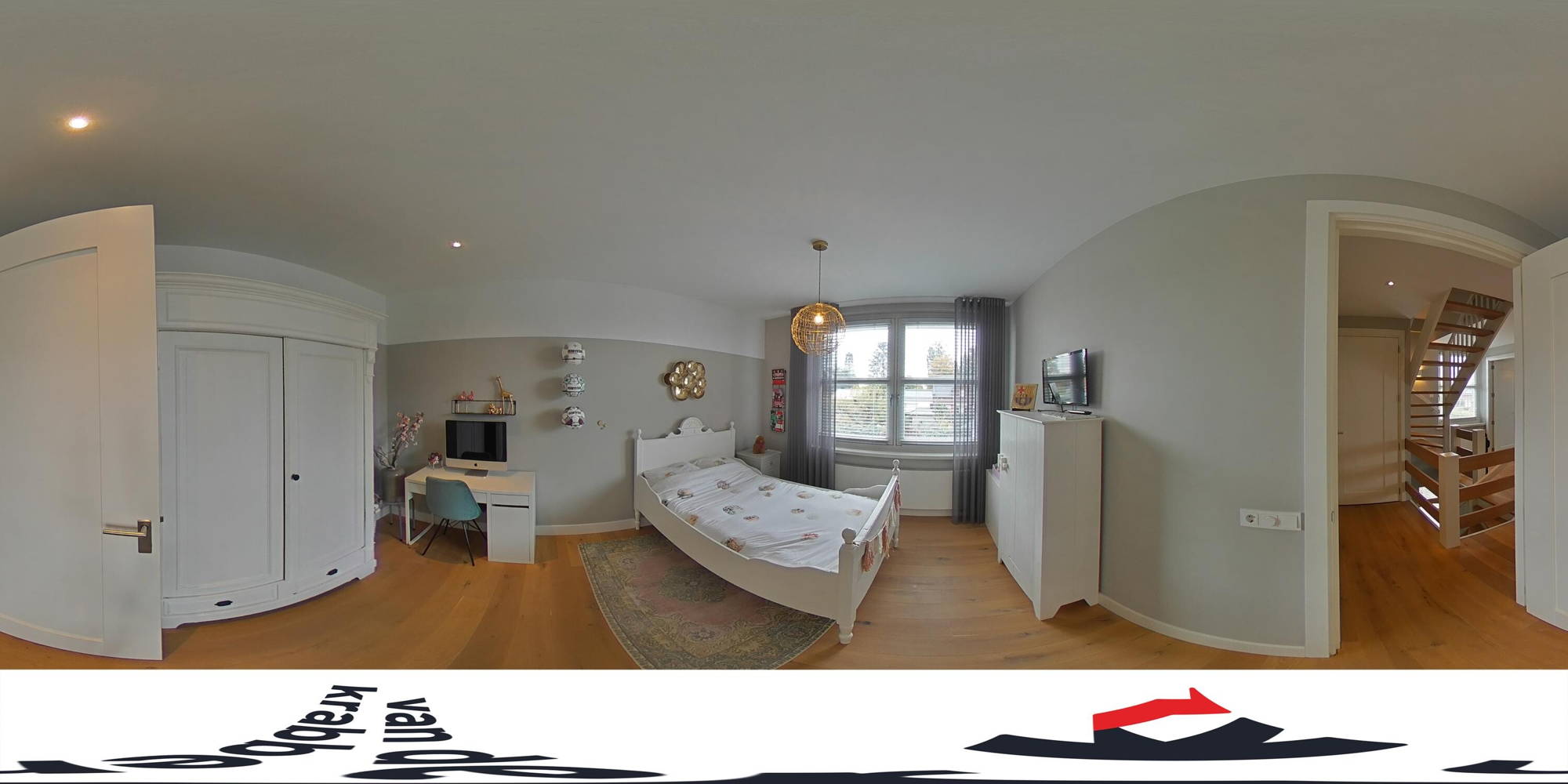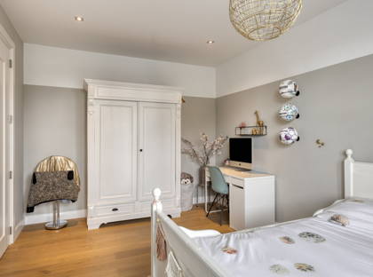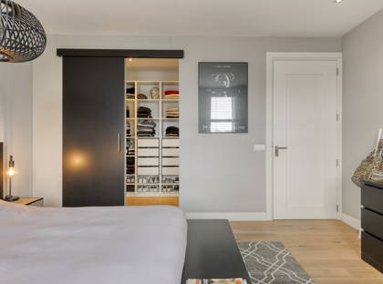 De tweede verdieping biedt een ruime slaapkamer met walk-in closet en volop bergruimte met mogelijkheden voor een tweede badkamer. Een ideale verdieping voor een oudere tiener, logees of een werkplek aan huis.