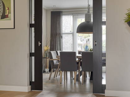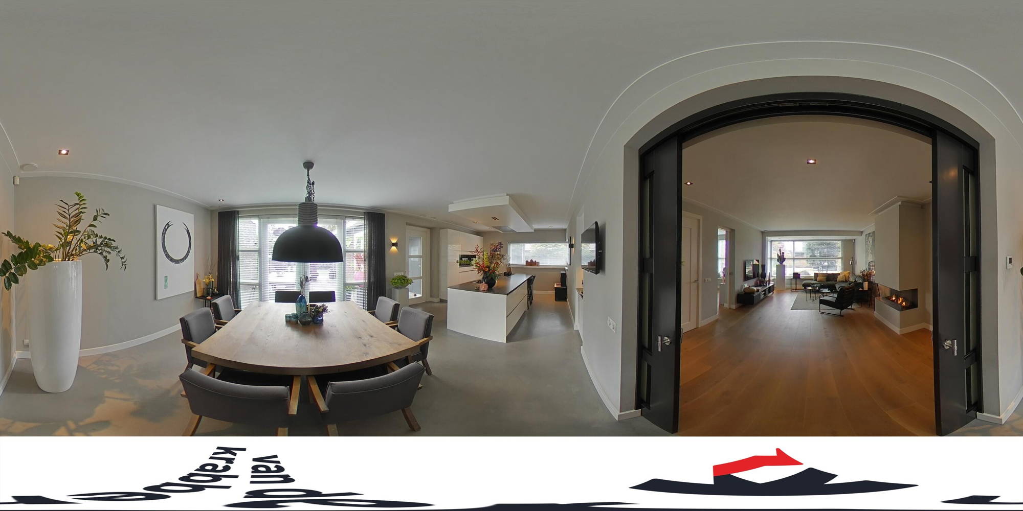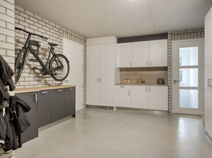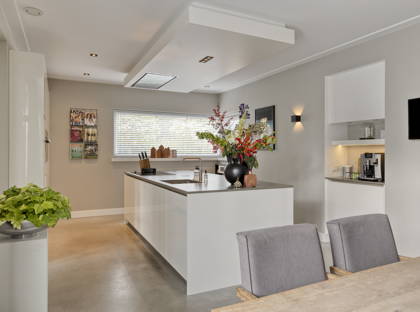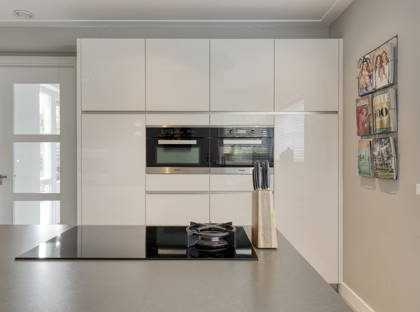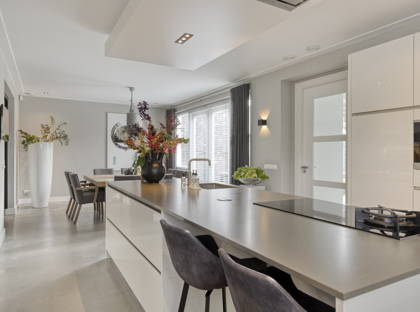 Via schuifdeuren kom je in de royale woonkeuken. Deze is strak vormgegeven en van alle gemakken voorzien. Het kookeiland met inductiekookplaat en een extra gaspit voor wokken is ideaal voor kookliefhebbers. In het eiland vind je ook de Quooker en vaatwasser. De kastenwand herbergt een koelkast en twee ovens, alles netjes weggewerkt voor een rustige uitstraling. Er is plaats voor een grote eettafel en de openslaande deuren creëren een fijn binnen-buiten gevoel.