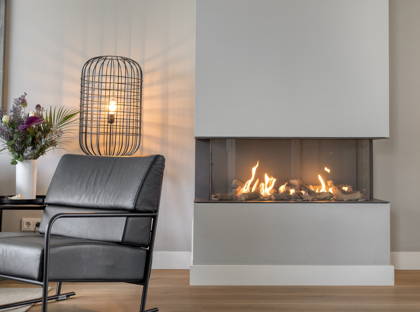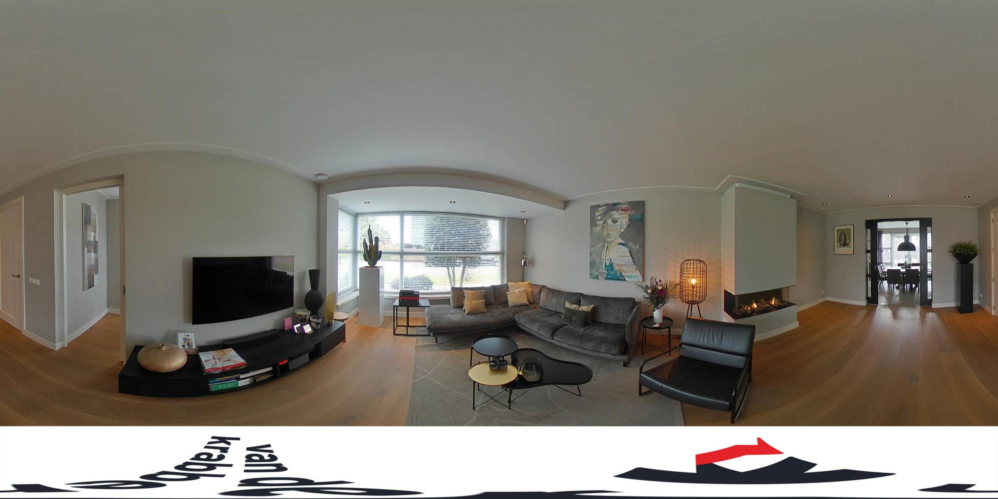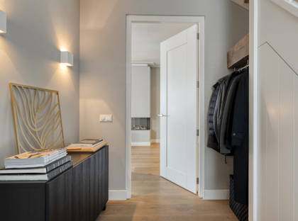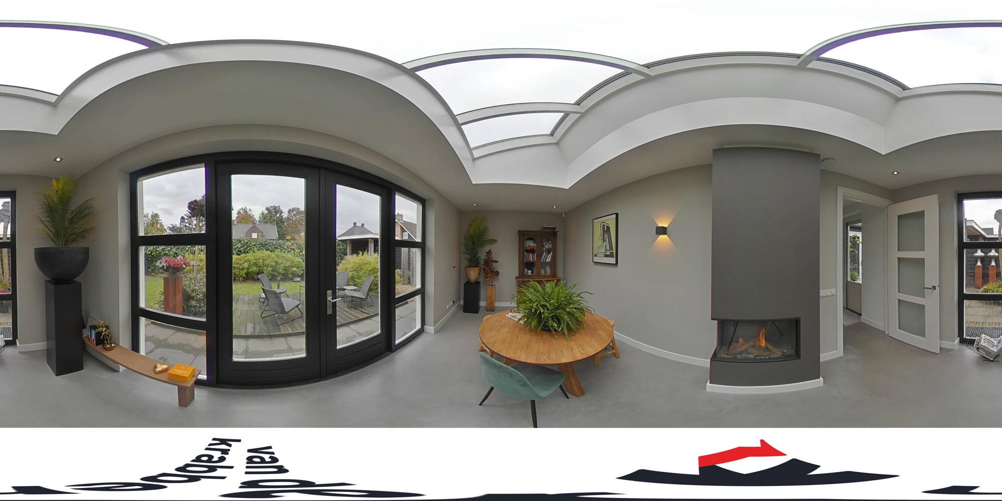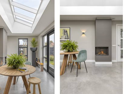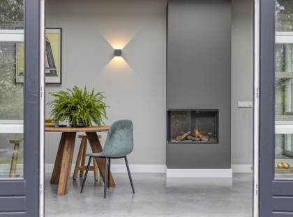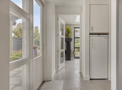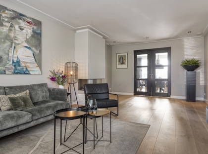 Je komt binnen in de ruime hal met meterkast, trapopgang en toegang tot de woonkamer. Direct valt het licht en de open uitstraling op. De woonkamer is sfeervol dankzij de fraaie haard en de grote ramen die zorgen voor veel daglicht.