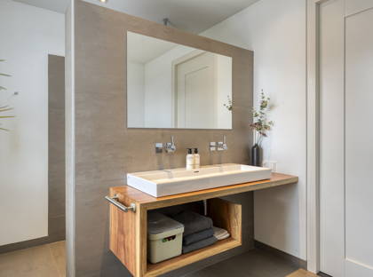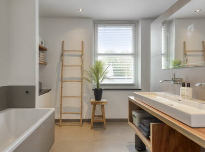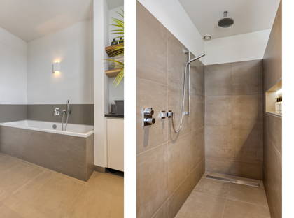 Op de eerste verdieping zijn drie ruime slaapkamers, allemaal voorzien van rolluiken. De hoofdslaapkamer heeft een walk-in closet. De badkamer is modern, sfeervol en compleet met ligbad, inloopdouche met regendouche, wastafelmeubel en een raam voor daglicht en natuurlijke ventilatie. Op de overloop bevindt zich nog een apart toilet.