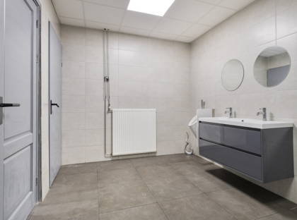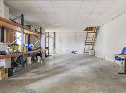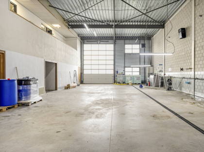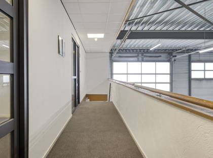 + Entresol; In de hal is een entresolvloer gerealiseerd die fungeert als kantoorruimte. Deze verdieping is bereikbaar via een vaste trap en biedt een duidelijke scheiding tussen werk- en kantooractiviteiten. Op de entresol zijn twee aparte kantoorruimtes gecreëerd. Hierdoor is de ruimte geschikt voor bijvoorbeeld administratie, overleg of werkplekken voor personeel.