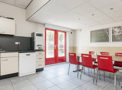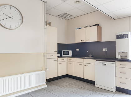 Naast de kantoorruimten beschikt het pand op de begane grond over een kantine, voorzien van een keukenblok in hoekopstelling, wat zorgt voor een prettige pauzeruimte voor personeel. Naast de kantine zijn er nog twee extra toiletgroepen aanwezig.