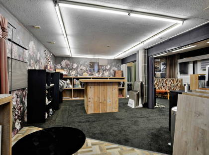 + Via openslaande deuren in de glasgevel bij de binnenkomst is er toegang naar het ruim van het voorste gedeelte, verder kan je via de openslaande deuren naar de aparte ruimte aan de achterzijde. Tot aan de ruimte met de dubbele deuren is een geheel nieuw systeemplafond gerealiseerd met led verlichting.